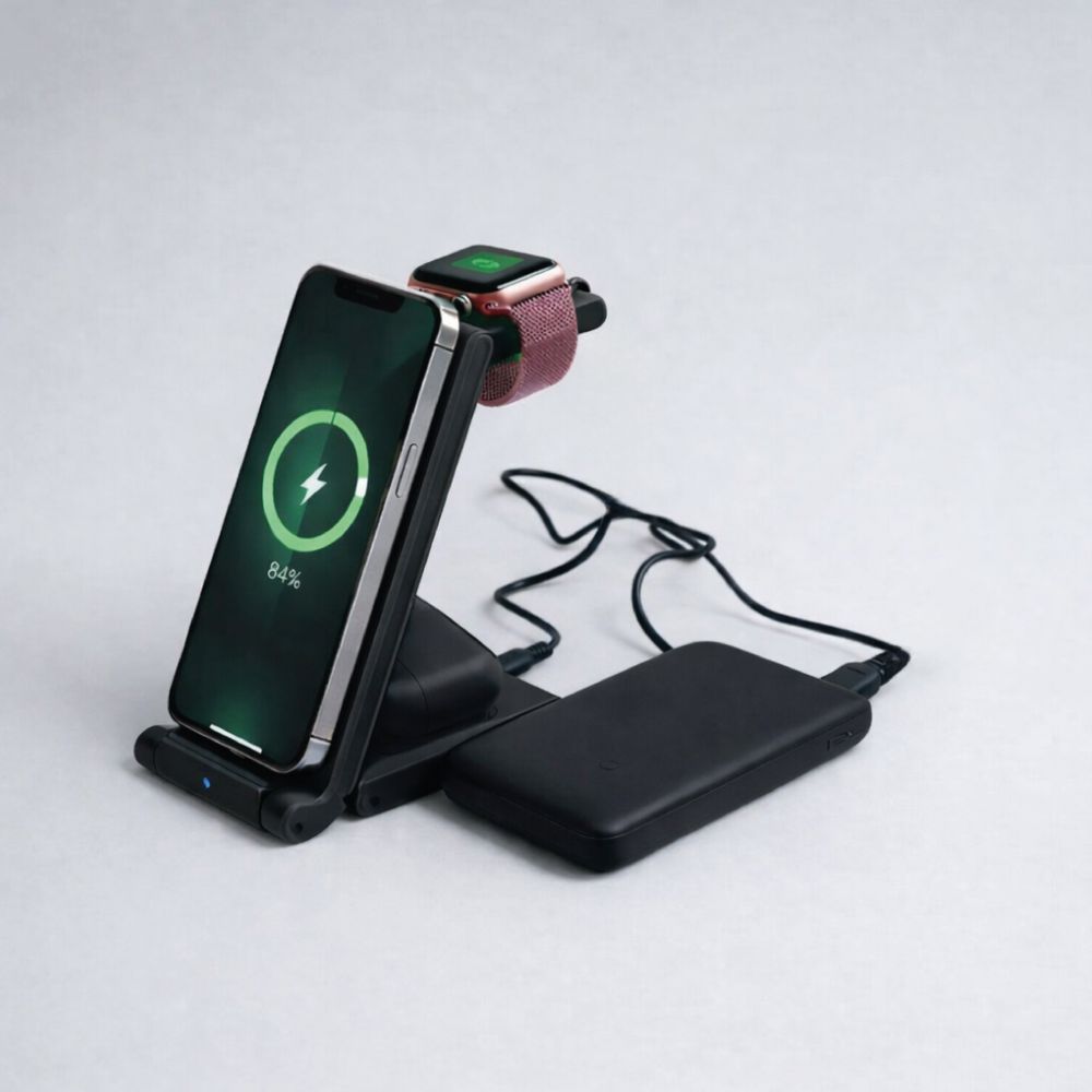 Smartphone, Kopfhörer und Apple Watch werden gleichzeitig an einer Station aufgeladen.